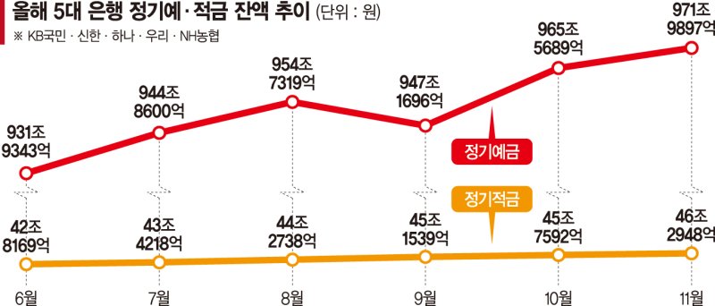 시중은행의 정기예·적금 잔액이 꾸준히 증가하고 있다. 5대 시중은행 정기예금 잔액은 6개월 만에 약 40조원이 불었고, 정기적금도 3조원 이상 늘었다. 기준금리 인하 기조가 꺾이면서 은행들이 예금금리를 올린 데다 단기 이벤트성 적금 상품을 잇달아 내놓으면서 연말 수요를 끌어당긴 것으로 보인다.