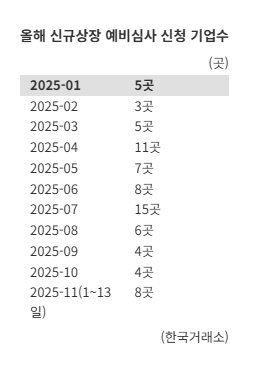 13일 한국거래소에 따르면 지난 1일부터 이날까지 신규상장을 위해 예비심사를 신청한 기업(코넥스, 스팩, 리츠 제외)은 8곳이다. 아직 이달 중순이 지나지 않았지만 지난달과 지난 9월 신청 기업 수인 4곳을 넘어선 규모다.