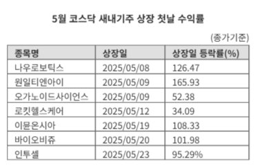5월 국내 증시에 상장한 코스닥 새내기주 모두 상장 첫날 공모가를 크게 넘어서면서 시장에 온기를 불어넣고 있다. 지난 9일 상장한 원일티엔아이는 공모가 대비 무려 165.93% 오르며 ‘따블(공모가 대비 2배)’에 성공했다. 지난 8일 데뷔한 나우로보틱스 역시 공모가보다 126.47% 오르며 높은 수익률을 시현했다. 이외에도 이뮨온시아(108.33%), 바이오비쥬(101.98%), 인투셀(95.29%) 등이 모두 급등세를 보였다.