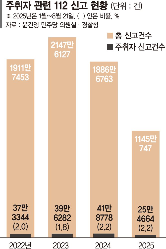 비율만 놓고 보면 일부 민원에 불과해 보이지만 절대 건수는 해마다 증가하는 추세다. 실제 주취자 신고는 2022년 37만3344건에서 2023년 39만6282건으로 늘었고, 지난해에는 41만8778건으로 역대 최대치를 기록했다. 특히 지난해의 경우 전체 112 신고 건수는 약 1887만건으로 전년 2148만건보다 줄었지만, 주취자 신고는 오히려 증가했다.