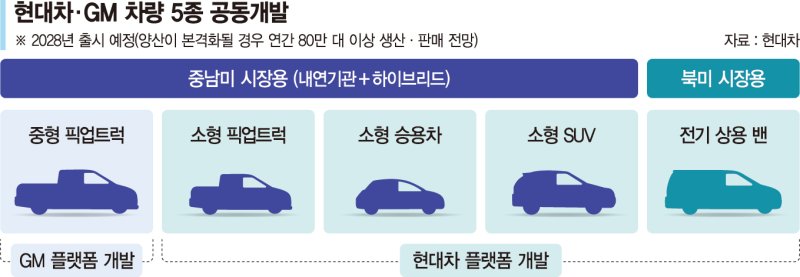 현대차와 GM은 내연기관과 하이브리드 시스템을 모두 탑재할 수 있는 중남미 시장용 중형 픽업·소형 픽업·소형 승용·소형 SUV 4종과 북미 시장용 전기 상용 밴 등 총 5종의 차세대 차량을 공동 개발해 나갈 계획이다. 양사의 공동 개발 차량 양산이 본격화되면 연간 80만대 이상을 생산 및 판매할 것으로 관측됐다.