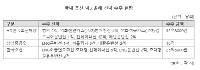 지난해 급감한 수주 실적은 지난해 카타르발 기저효과 때문으로 풀이된다. 한국 대형 조선 3사는 2023년 말부터 작년 초까지 카타르 측으로부터 LNG 운반선 44척을 수주했다. 모두 17만6000CBM급으로 HD한국조선해양 17척, 삼성중공업 15척, 한화오션 12척 등이다.