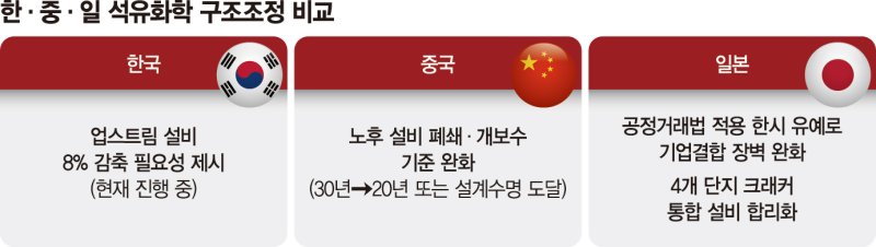 일본은 1980년대 초 오일쇼크 여파로 석유화학 산업 수익성이 악화하자 공정거래법 적용을 한시 유예해 기업결합(M&A) 장벽을 완화하고 구조조정을 지원했다. 현재도 동북아 지역의 공급과잉에 대응하기 위해 4개 산업단지에서 크래커 업체 통합과 설비 합리화를 추진 중이며, 전체 생산능력의 37% 감축을 목표로 하고 있다.