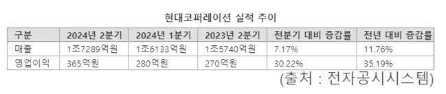 30일 업계에 따르면 현대코퍼레이션은 지난 29일 매출 1조7289억원, 영업이익 365억원의 2·4분기 잠정실적을 공시했다. 전년 동기 대비 각각 11.76%, 35.19% 증가한 규모로, 분기 기준 역대 최고 실적을 거뒀다.