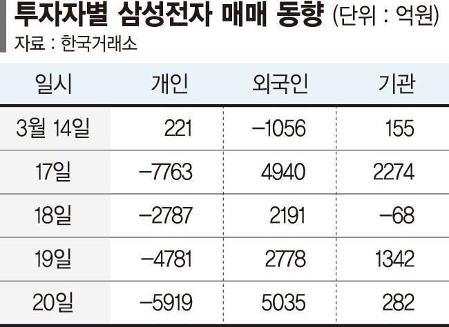반면 개인은 최근 4거래일간 2조1000억원이 넘는 삼성전자의 주식을 팔았다. 연초부터 지난달 말까지 6337억원어치를 사들인 것과 비교하면 이탈세가 가속화되고 있는 것이다.