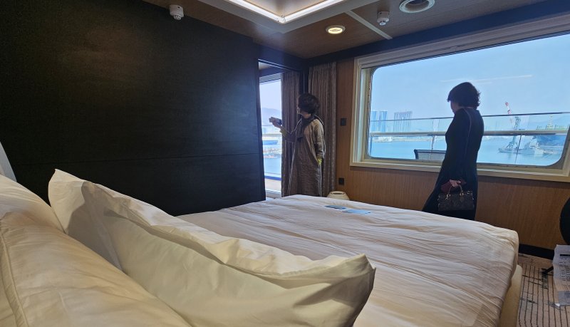 | 부산항을 모항으로 하는 팬스타 크루즈의 신형 선박 '미라클호'가 지난달 9일 첫 내부 공개 행사를 열었다. 선내 가장 높은 등급 객실인 프레지덴셜 스위트의 침실을 방문객들이 구경하고 있다. 사진=변옥환 기자 |