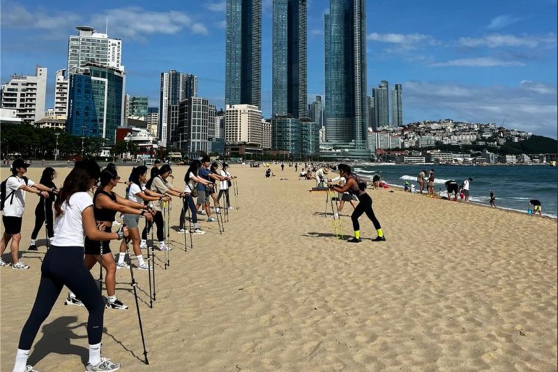 | 지난해 상반기 부산 해운대해수욕장에서 진행된 '해양치유 체험 프로그램' 모습. 해변 노르딕 워킹에 대한 강좌가 진행되고 있다. 부산관광공사 제공 |
