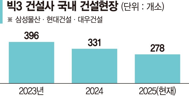 대우건설 등 '빅3' 건설사들의 국내 건설현장이 2년 새 약 30% 감소한 것으로 나타났다. 불황 속 공사비 상승에 안전 리스크까지 겹치면서 업계 전반의 신음 소리가 갈수록 커지고 있다.