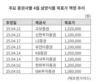 한화투자증권은 이달 들어 삼양식품의 목표가를 120만원으로 제시했고, 한국투자증권과 유안타증권, LS증권 역시 110만원의 목표주가를 새로 내걸었다.