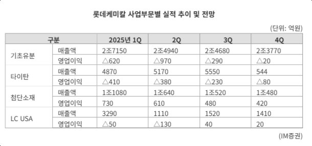 특히 기초유분 부문은 매출 2조4940억원, 영업손실 970억원으로 전분기 대비 매출은 8.1% 줄고 영업손실은 56.5% 확대될 전망이다. 롯데케미칼의 기초소재 부문은 지난해 3·4분기부터 4개 분기 연속 적자를 기록할 것으로 보인다. 미국 자회사 LC USA도 에탄 가격 약세에도 불구하고 모노에틸렌글리콜(MEG) 설비 정기보수 여파로 약 130억원의 영업손실이 예상된다.