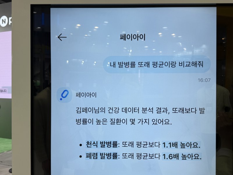 카카오페이는 '페이아이'를 통해 사용자의 결제·건강 데이터를 분석해 정보를 제공한다. 지난 6월 출시된 'AI로 내 건강 관리하기'는 사용자가 카카오페이에 보험 마이데이터를 연동하면 최근 3개년 건강검진 데이터를 활용해 질병 예측과 건강 정보를 제공한다. 사용자가 "내 발병률 또래 평균이랑 비교해줘"라고 묻자 페이아이는 건강 데이터를 분석해 또래보다 발병률이 높은 질환을 소개했다.