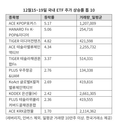 21일 한국거래소에 따르면 지난 15일부터 19일까지 가장 높은 수익률을 기록한 종목은 ‘ACE KPOP포커스’로 일주일 간 5.17% 급등했다. 이어 ‘HANARO Fn K-POP&미디어’(5.06%), ‘TIGER 미디어컨텐츠’(4.82%)가 각각 2,3위에 오르며 미디어·엔터테인먼트 섹터 강세를 입증했다. 레버리지 및 인버스 종목과 일평균 거래량 10만주 미만 종목을 제외한 기준이다.