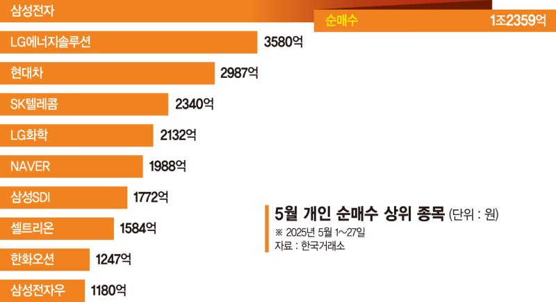 27일 한국거래소에 따르면 이달에 개인투자자가 가장 많이 순매수한 종목은 삼성전자이다. 외국인이 1조3820억원어치 순매도하는 동안 개인은 1조2359억원어치 사들여 물량을 대부분 받아냈다.