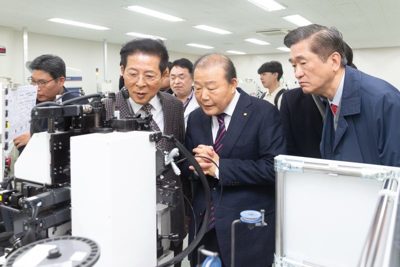 | 양재생 부산상공회의소 회장(앞줄 오른쪽 두번째)이 4일 오전 리노공업 제조 현장을 둘러보고 있다. 부산상의 제공 |