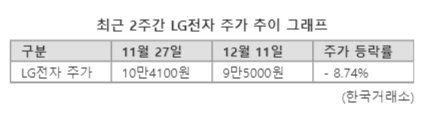 11일 한국거래소에 따르면 최근 2주간(11월 27일~12월 11일) LG전자의 주가는 8.74% 하락했다. 지난달 27일 10만4100원이던 주가는 이날 9만5000원까지 빠졌다. 지난달 29일부터 지난 8일까지는 8거래일 연속 하락세를 기록하기도 했다. LG전자의 주가가 8거래일 연속 하락세를 기록한 건 지난 2022년도 9월 14일부터 29일까지 11거래일 연속 하락을 기록한 이후 약 1년 2개월 만이다.