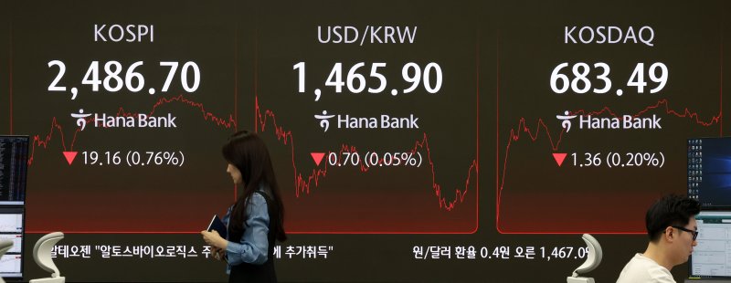 | 3일 코스피지수가 전 거래일보다 19.16p(0.76%) 하락한 2486.70, 코스닥 지수는 1.36p 떨어진 683.49에 각각 장을 마쳤다. 이날 외환시장에서 원·달러 환율은 오후 4시 기준으로 전 거래일 대비 0.15% 상승한 1464.70원을 기록했다. 서울 중구 하나은행 본점 딜링룸 전광판에 지수와 환율이 표시되고 있다. 뉴시스 |
