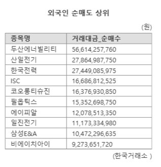 하지만 이와중에도 외국인은 원자력과 전력 관련 종목은 대거 매집했다. 원전주인 두산에너빌리티를 566억원어치 가장 많이 사들였다. 또 비에이치아이도 93억원 순매수해 순매수 상위 종목 10위에 이름 올렸다.