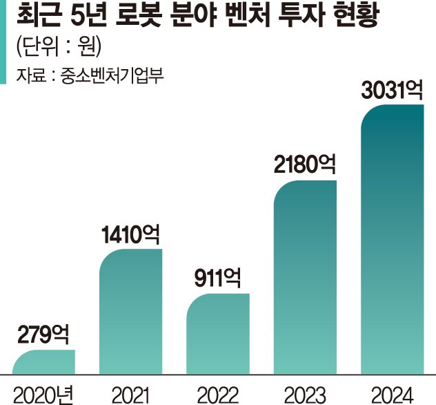 23일 중소벤처기업부에 따르면 지난해 로봇 분야 벤처투자는 전년 대비 39.0% 증가한 3031억원에 달했다. 지난 2020년 279억원에 불과했던 로봇 벤처 투자액이 2021년 1410억원, 2022년 911억원, 2023년 2180억원을 기록한 데 이어 지난해 3000억원을 넘어선 것이다. 5년 새 투자금이 약 10배 가량 증가한 것으로 이는 최근 5년 딥테크 분야 총 투자 증가율(85.4%)을 훌쩍 넘어서는 수치다.