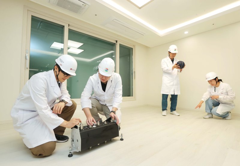 | LX하우시스 연구원들이 층간소음 저감 바닥구조를 적용한 공간에서 바닥충격음 시험을 하고 있다. LX하우시스 제공 |