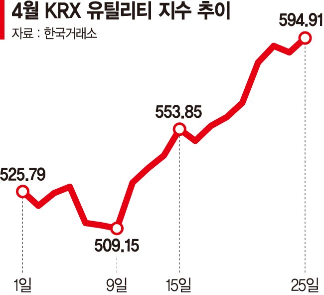 27일 한국거래소에 따르면 지난 2~25일 전체 KRX 지수 가운데 가장 높은 수익률을 거둔 지수는 'KRX 유틸리티 지수'로 이달 들어 15.00% 상승했다. 코스피, 코스닥 지수의 이달 상승률이 2.63%, 8.45% 수준이었던 것과 비교해 두 배 이상 급등했다.