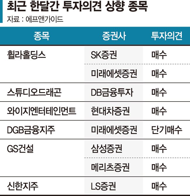하락장에도 투자의견이 상향된 종목들에 관심이 모아지고 있다. 증권사의 투자의견은 목표주가와 달리 변경이 잦지 않고, 상향 조정됐을 경우 주가 상승 여력이 크다고 해석된다.