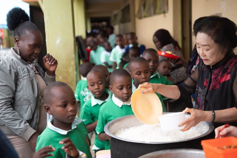 | 지난 2월 윤영순씨(오른쪽)가 아프리카 교육사업에 헌신한 딸 고 나현씨를 기리기 위해 케냐 단도라 '마마 나현스쿨'을 찾아 학생들을 위한 급식 배식 활동에 참여하고 있는 모습. 굿네이버스 제공 |