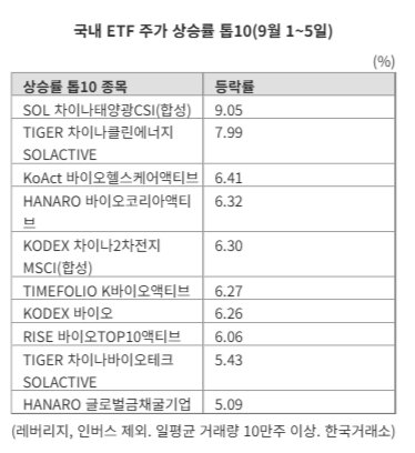 7일 한국거래소가 집계한 ETF 수익률에 따르면 지난 1일부터 5일까지 ETF 시장에서 가장 높은 수익률을 기록한 상품은 ‘SOL 차이나태양광CSI(합성)’으로 전주 대비 9.05% 올랐다. 레버리지 및 인버스 종목과 일평균 거래량 10만주 미만 종목을 제외한 기준이다.