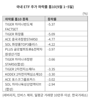 화장품과 일부 이차전지 ETF에는 매도세가 집중됐다. ‘TIGER 화장품’은 한 주간 5.09% 떨어졌고, ‘SOL 화장품TOP3플러스’ 역시 4.22% 하락했다. ‘TIGER 차이나반도체FACTSET’(-5.37%), ‘ACE 중국과창판STAR50’(-4.77%) 등 중국 기술주 ETF도 낙폭을 기록했다.