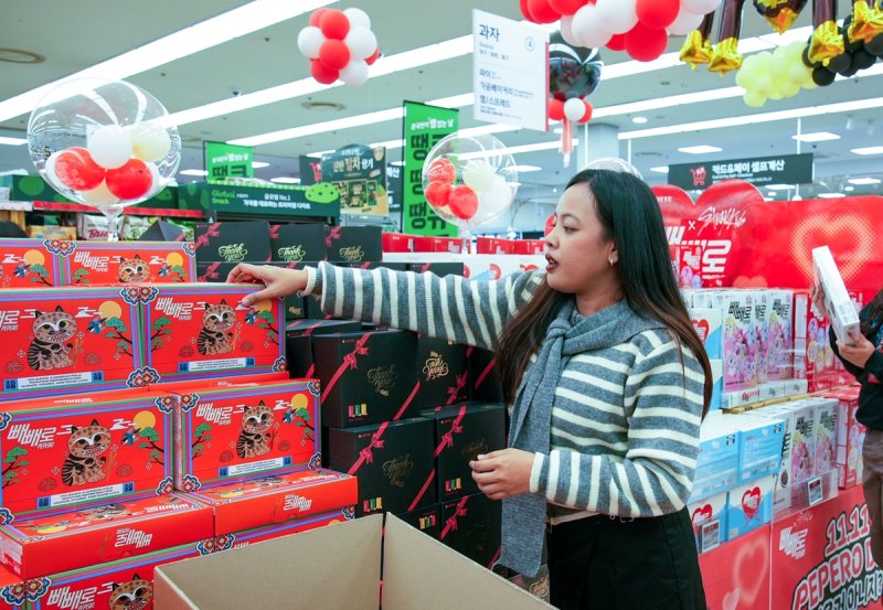 | '빼빼로 에이전트 피' 활동에 참여한 외국인 참가자가 마트에 진열된 빼빼로를 살펴보고 있다. 롯데웰푸드 제공 |