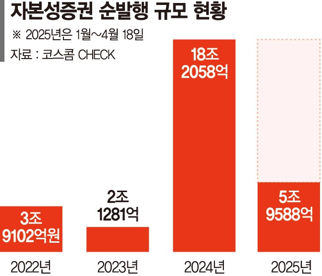 20일 코스콤CHECK에 따르면 올해들어 4월 18일까지 자본성증권 순발행 규모는 5조9588억원으로 집계됐다. 자본성증권 순발행 규모는 2022년 3조9102억원, 2023년 2조1281억원 수준이었으나 2024년 18조2058억원으로 전년 대비 9배 가까이 뛰었다. 자본성증권은 후순위채, 신종자본증권(영구채) 등을 말한다. 회계상 자본으로 인정돼 기업과 금융사들이 현금확보와 재무건전성 관리를 위해 활용도를 높이고 있다.