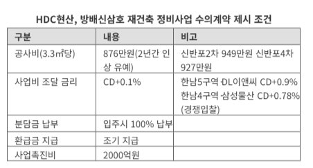 사업비 CD+0.1%, 3.3㎡당 공사비 876만원, 2년 유예  |