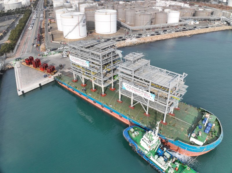 DL이앤씨가 국내 석유화학 업계 사상 최대 규모 투자인 에쓰오일의 '샤힌 프로젝트' 건설 현장에 선 조립된 배관 지지 구조물(PAR) 모듈을 설치했다고 7일 밝혔다. PAR 모듈은 플랜트의 원료와 생산품 등의 이동 통로 역할을 하는 배관을 지지하는 구조물이다.