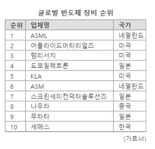 반도체 장비 상위 10개 기업 중 △어플라이드머티리얼즈 △램리서치 △KLA 등 3곳은 미국 회사다. 또한 △도쿄일렉트론 △스크린세미컨덕터솔루션스 △무라타 등 3곳은 일본 업체다. '슈퍼을'로 불리는 ASML과 함께 ASM은 네덜란드에 본사가 있다. 특히 중국 업체로는 처음으로 나우라(8위)가 10위권에 진입했다.
