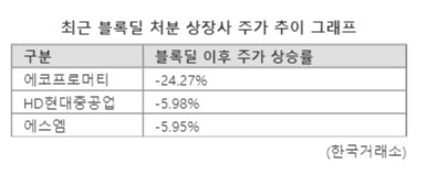 [파이낸셜뉴스] 상장사의 블록딜(시간외 대량매매)이 잇따르는 가운데 관련 종목들의 주가가 휘청하고 있다.