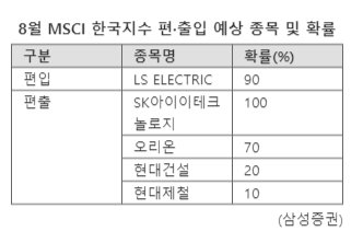 에코프로머티 등 2개 종목의 편출을 예상했다. 또 오리온, 현대건설이 순차적으로 편출될 가능성이 있는 것으로 판단했다.