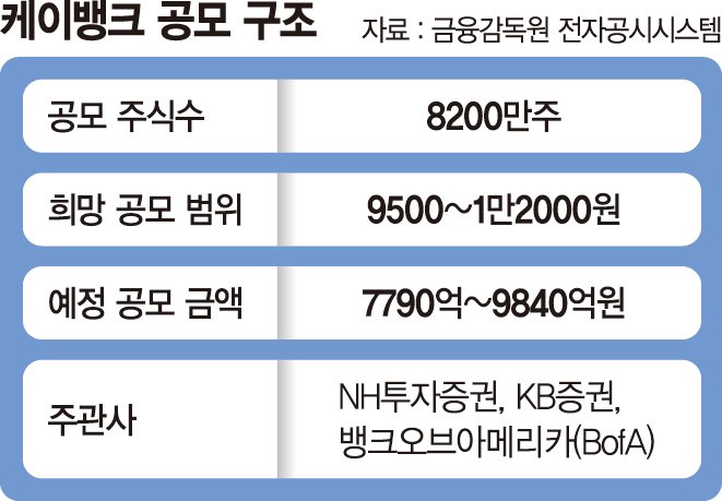 IB업계 관계자는 "과거 카카오뱅크는 상장 당시 고평가 논란에도 기관 투자자들이 은행보다는 '플랫폼'에 주목해 성장성을 높게 평가했다"며 "카카오뱅크는 인터넷 전문은행 1호 상장으로서 프리미엄을 받았지만 케이뱅크는 상황이 다르다"고 말했다.