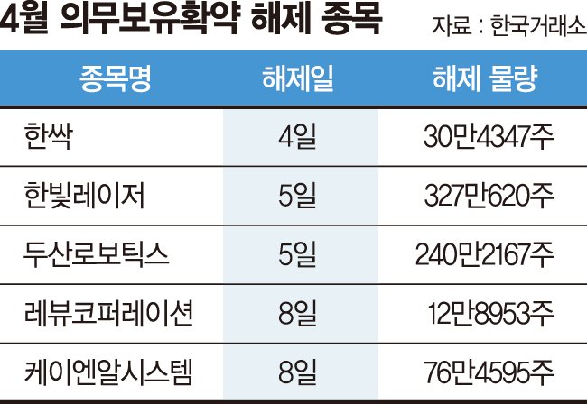 같은 날 한빛레이저 역시 락업 물량이 쏟아지며 9.97% 급락세를 보였다. 지난 1월 상장 당시 3개월 의무보유확약을 걸었던 기관과 기타주주의 물량이 출회된 것으로 규모가 327만620주에 달했다. 한빛레이저는 이날도 주가가 4.17% 떨어지며 물량 부담의 여파가 이어졌다.