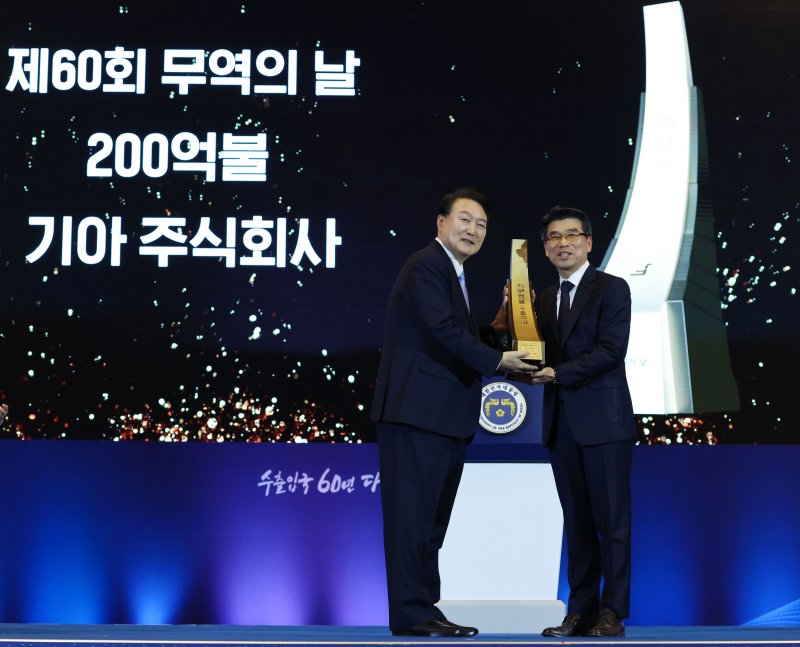 | 기아, 글로벌 불황 뚫고 200억弗 수출의 탑윤석열 대통령이 5일 서울 강남구 코엑스에서 열린 제60회 무역의 날 기념식에서 송호성 기아 대표이사에게 200억불 수출의 탑을 수여한 뒤 기념촬영을 하고 있다. 연합뉴스 |