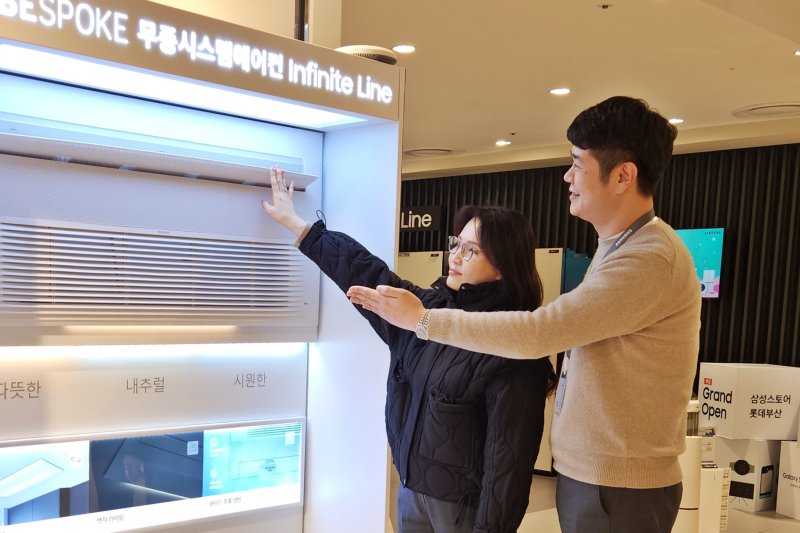 | 부산 부전동 롯데백화점 부산본점 6층 삼성전자 매장에서 고객이 '천정형 시스템 에어컨' 전시 상품을 보며 관련 기능에 대한 설명을 듣고 있다. 롯데쇼핑 제공 |