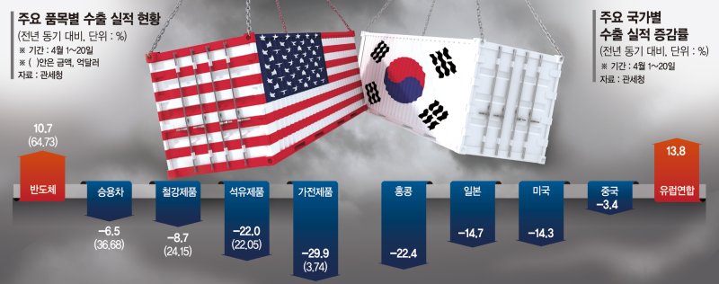 미국발 '관세폭풍'이 수출을 강타할 조짐이다. 4월 중순(1~20일)까지 수출이 1년 전 대비 5.2% 감소하면서 미국발 관세전쟁 여파가 수출에 악영향을 미치고 있음이 지표로 확인됐다. 도널드 트럼프 미국 대통령이 주도한 국가별 상호관세 중 한국에는 기본관세 10%만 부과됐다. 나머지 상호관세율은 90일간 유예됐다. 하지만 4월 20일까지의 실적만으로도 수출 경고등이 켜졌다. 특히 주력 수출품 10개 중 9개의 수출이 줄었다. 자동차, 철강, 알루미늄의 품목관세 부과에 이어 차 부품 관세 부과가 예정돼 있어 수출여건의 추가 악화가 불가피하다.