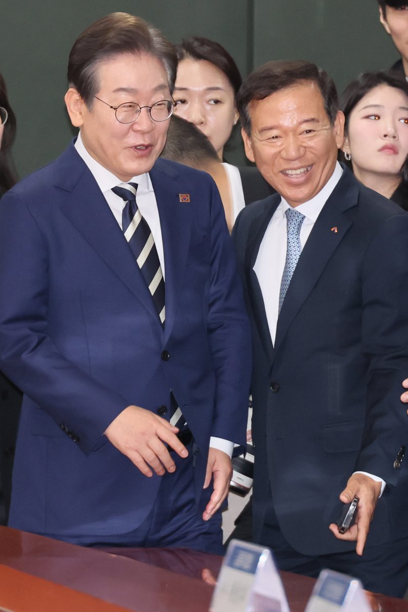 | 더불어민주당 이재명 대선 경선 후보(왼쪽)가 21일 서울 여의도 금융투자협회에서 열린 정책간담회에 참석하기 위해 입장하고 있다. 오른쪽은 서유석 금융투자협회장 연합뉴스 |