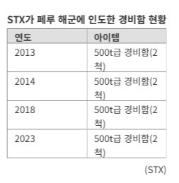 국산 전투 장갑차 '중남미 최초 수출' 14일 업계에 따르면 STX는 지난 2013년 페루 해군과 500t급 경비정 건조 계약을 체결했다. 2023년까지 총 8척의 선박을 인도하며 누적 약 1억3000만달러(한화 약 1800억 원)의 방산 수출 실적을 기록했다. 2024년에는 4월, 페루 육군의 차륜형 장갑차 사업 우선협상