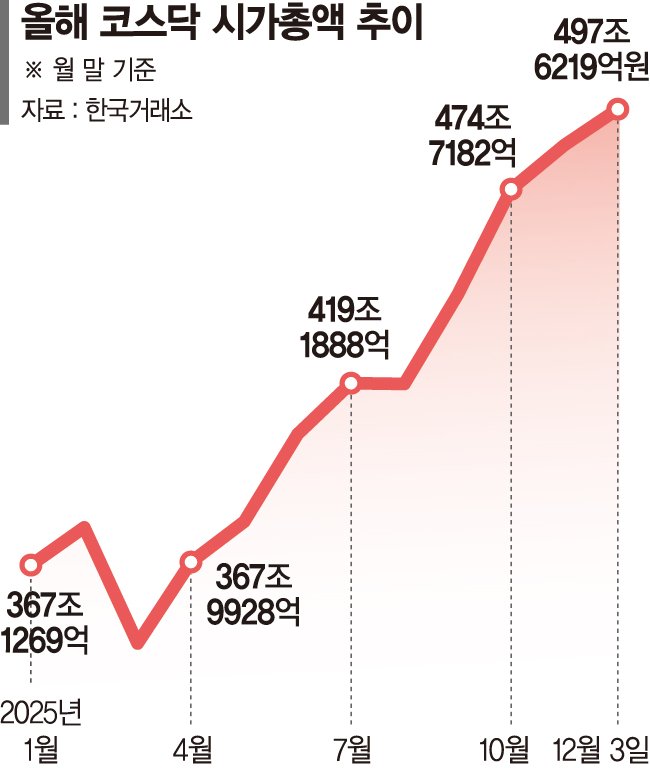 코스닥시장이 사상 첫 '시가총액 500조원' 입성 초읽기에 들어갔다. 증시 활황에도 상대적 소외가 뚜렷했지만, 지난달 말 이후 가격 매력과 정부정책 기대감 등으로 연말 뒷심 발휘에 무게가 실리면서 시총 500조원에 바짝 다가섰다.