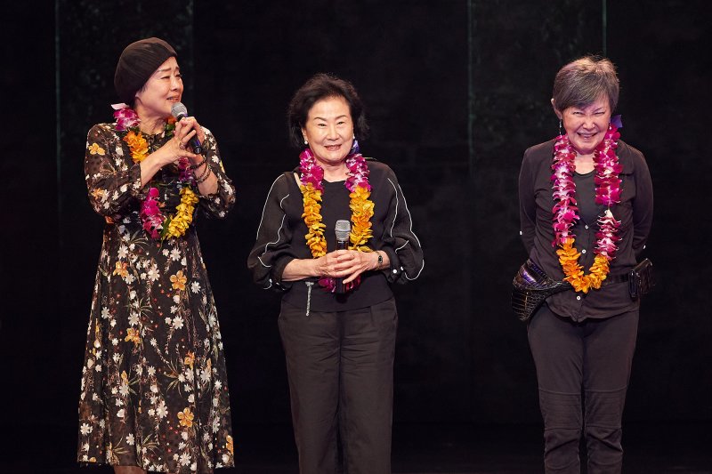 | '시스터즈' 실제 주인공들이 커튼콜에 참석했다. 왼쪽부터 '바니걸스' 고재숙, '이시스터즈' 김희선, '코리안 키튼즈' 윤복희. 신시컴퍼니 제공 |