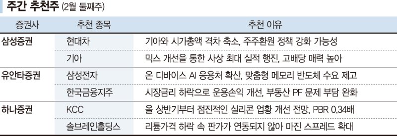 하나증권은 한국금융지주, KCC, 솔브레인홀딩스를 추천 리스트에 올렸다. 한국금융지주는 부동산 프로젝트파이낸싱(PF) 부진에도 지난해 10% 이상 자기자본이익률(ROE) 달성한 것으로 추정했다. 주가순자산비율(PBR) 0.4배 수준의 낮은 밸류에이션으로 가격 매력도 역시 높다는 평가다.