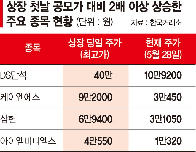 '따블'(공모가 대비 2배 상승)에 성공한 기업 중에서도 유사한 사례가 잇따르고 있다. 지난 3월 코스닥시장에 입성한 삼현이 대표적이다. 상장 첫날 공모가(3만원) 대비 최고 131% 가량 오르며 6만9400원까지 치솟았지만 지금은 3만1050원으로 반토막이 났다.