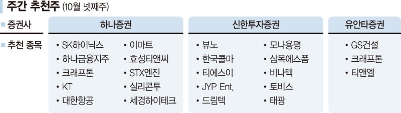 KT를 추천했다. SK하이닉스는 마이크론 실적 발표에서 수요 약화로 인한 D램 가격 협상력 저하 우려를 불식했다고 분석했다. KT 역시 기대 배당 수익률 6~7%대를 감안하면 현재 주가 저평가 영역에 위치했다고 봤다. 특히 KT는 오는 11월 밸류업 정책을 발표 예정이다.