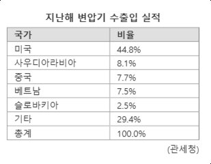 특히 미국 시장은 국내 기업들의 핵심 수출지라는 점에서 관세 동향에 관심이 모이고 있다. 관세청에 따르면 지난해 변압기 수출 비중 중 미국은 전체의 44.8%(수출액 약 18억2361만 달러)를 차지해 단일 국가 기준 가장 높은 비중을 기록했다. 이어 사우디아라비아(8.1%), 중국(7.7%), 베트남(7.5%) 등의 순으로 나타났다.