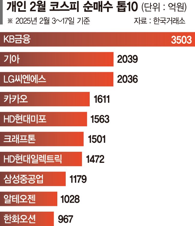 종목별로는 개인은 이달 들어 KB금융의 주식을 3503억원어치 사들여 전체 주식시장에서 최대 순매수를 기록했다. 이어 기아와 LG씨엔에스에도 각각 2000억원이 넘는 순매수 대금이 몰렸다.이 외에도