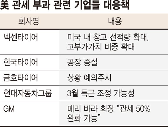 24일 업계에 따르면 타이어·자동차 업계 등 미국 관세 부과시 피해가 예상되는 기업들은 여러 시나리오를 구상하며 조금씩 대응 방안을 구체화하고 있다.